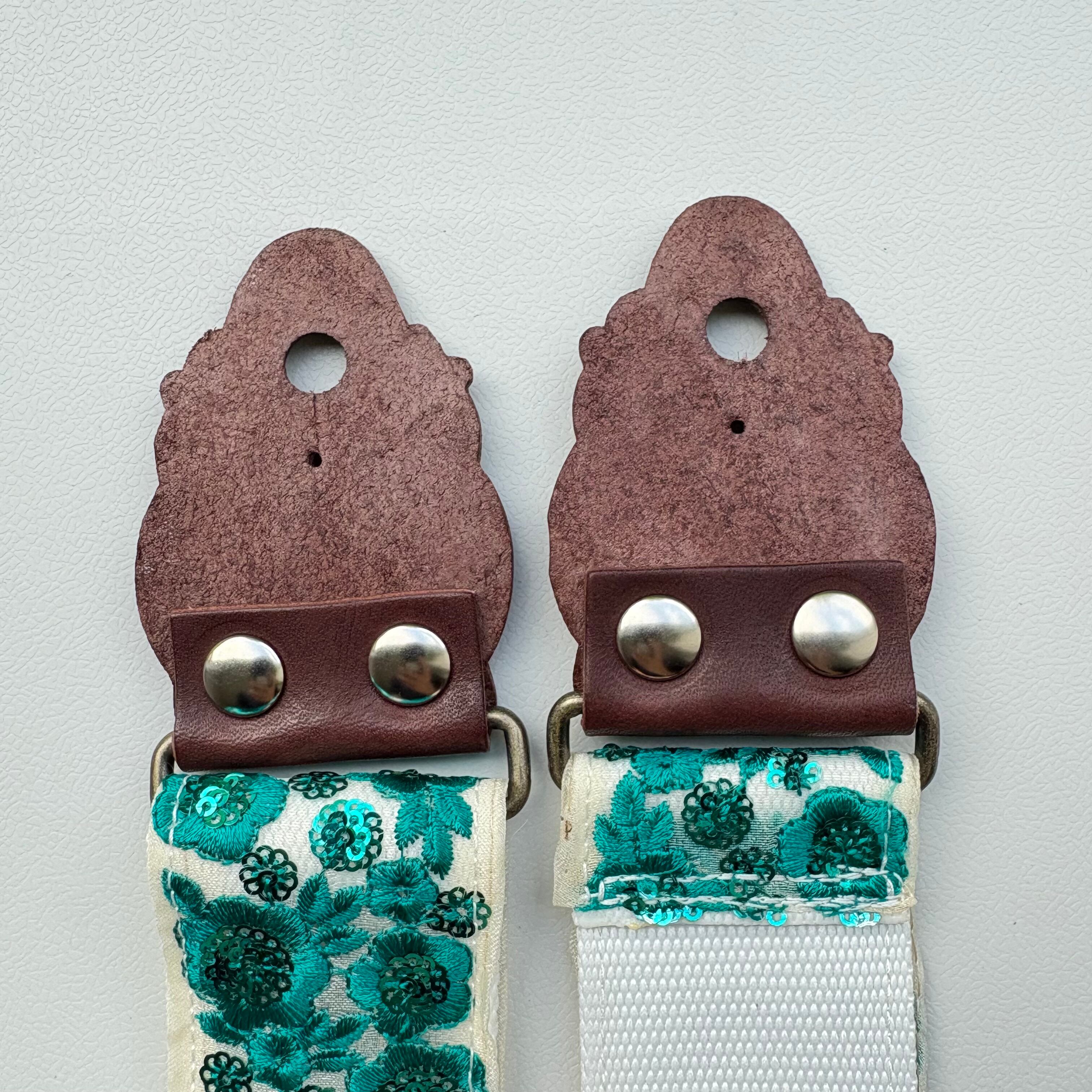 刺繍糸とスパンコールがエメラルドグリーンなので落ち着いた色合いながら、鮮やかな華やかさがあります。スパンコールが柄の存在感を高めていて、目を惹きます。