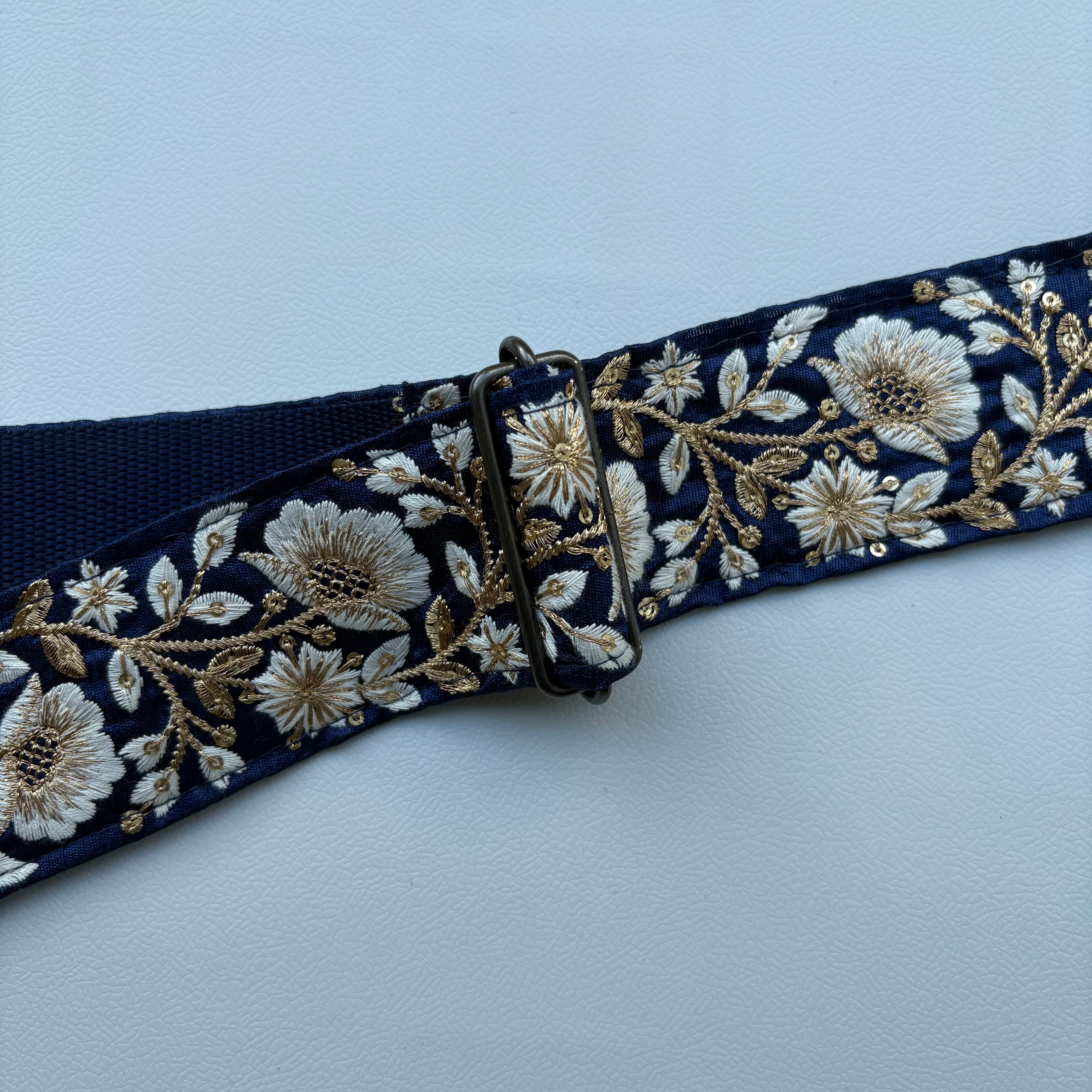 深みのある青色に白い刺繍のお花が施されている大人っぽいデザインです。金色の刺繍糸とスパンコールが日に当たるときらきら光ります。