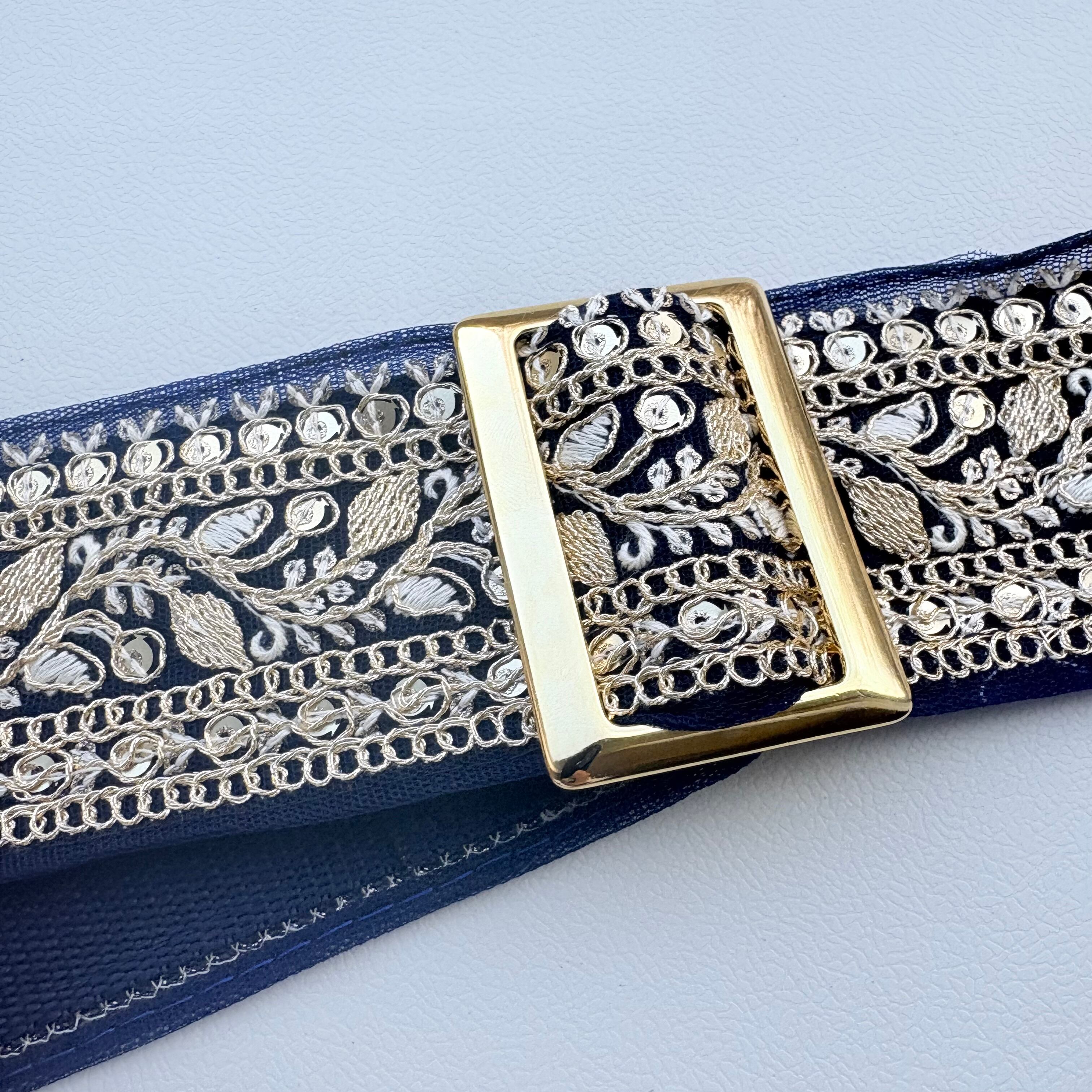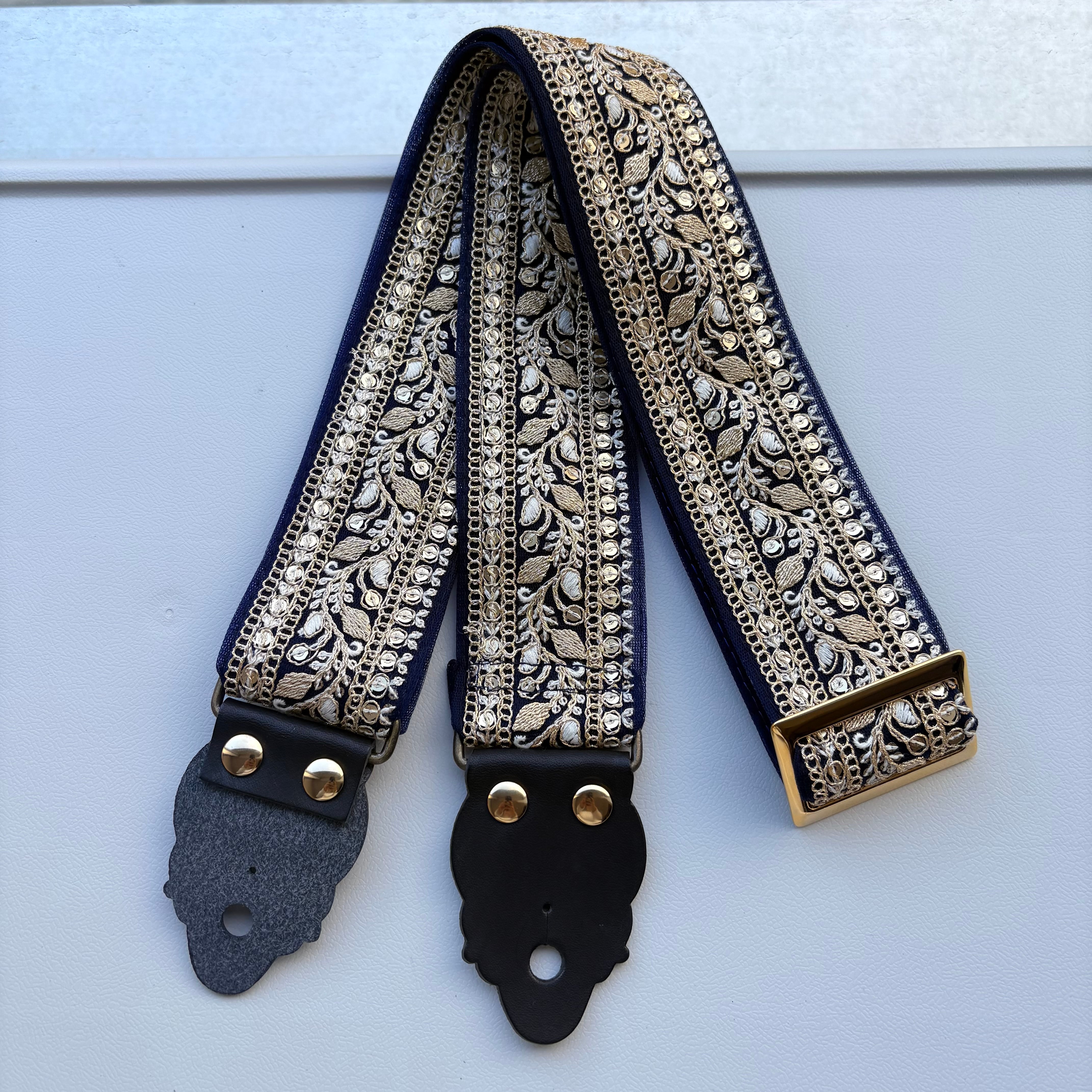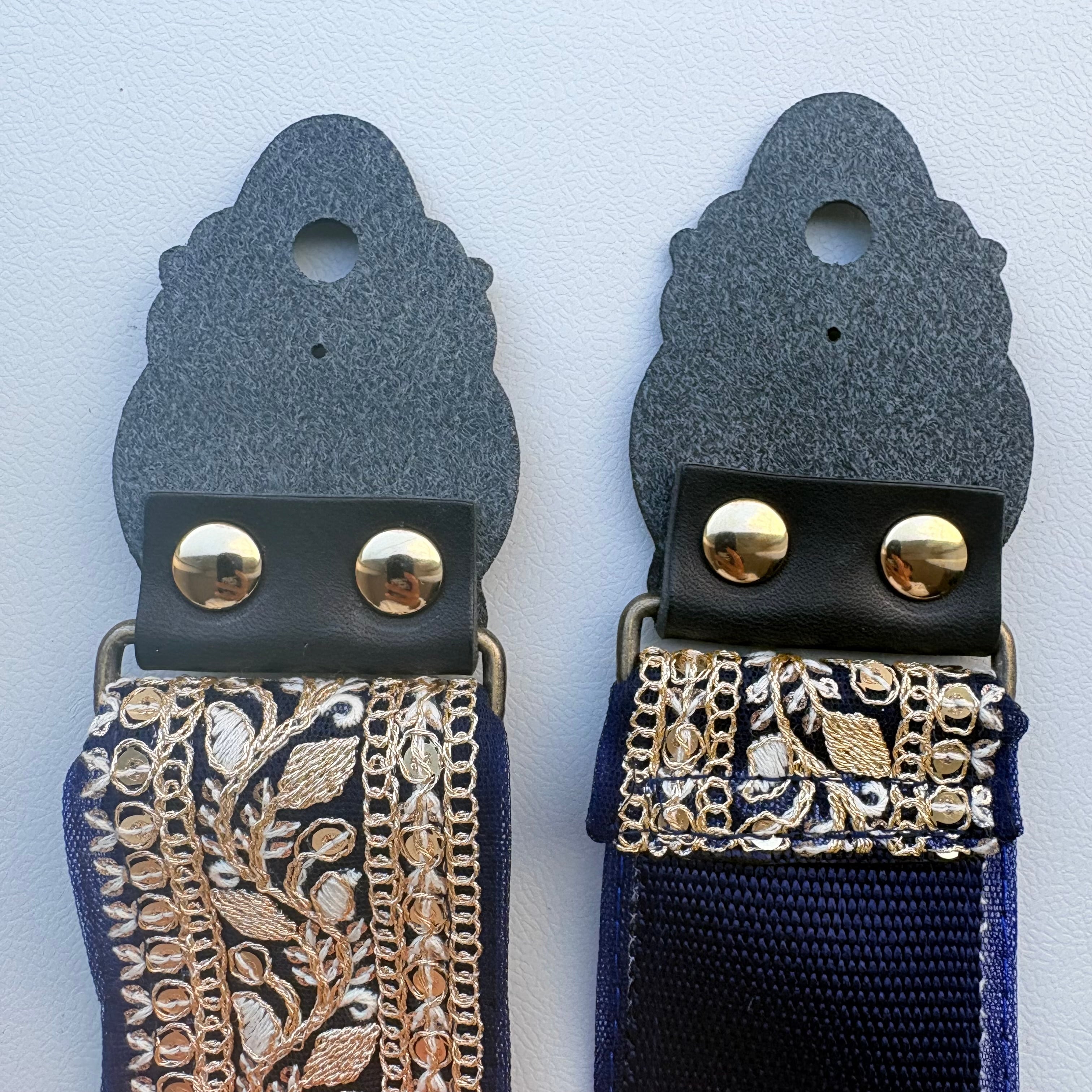 インド刺繍リボン特有の、繊細な刺繍と高級感のあるデザインが楽器を華やかに彩ってくれるでしょう。ネイビーの生地にゴールドの刺繍糸、スパンコールが華やかに催され、楽器の美しさをより一層引き立てます。