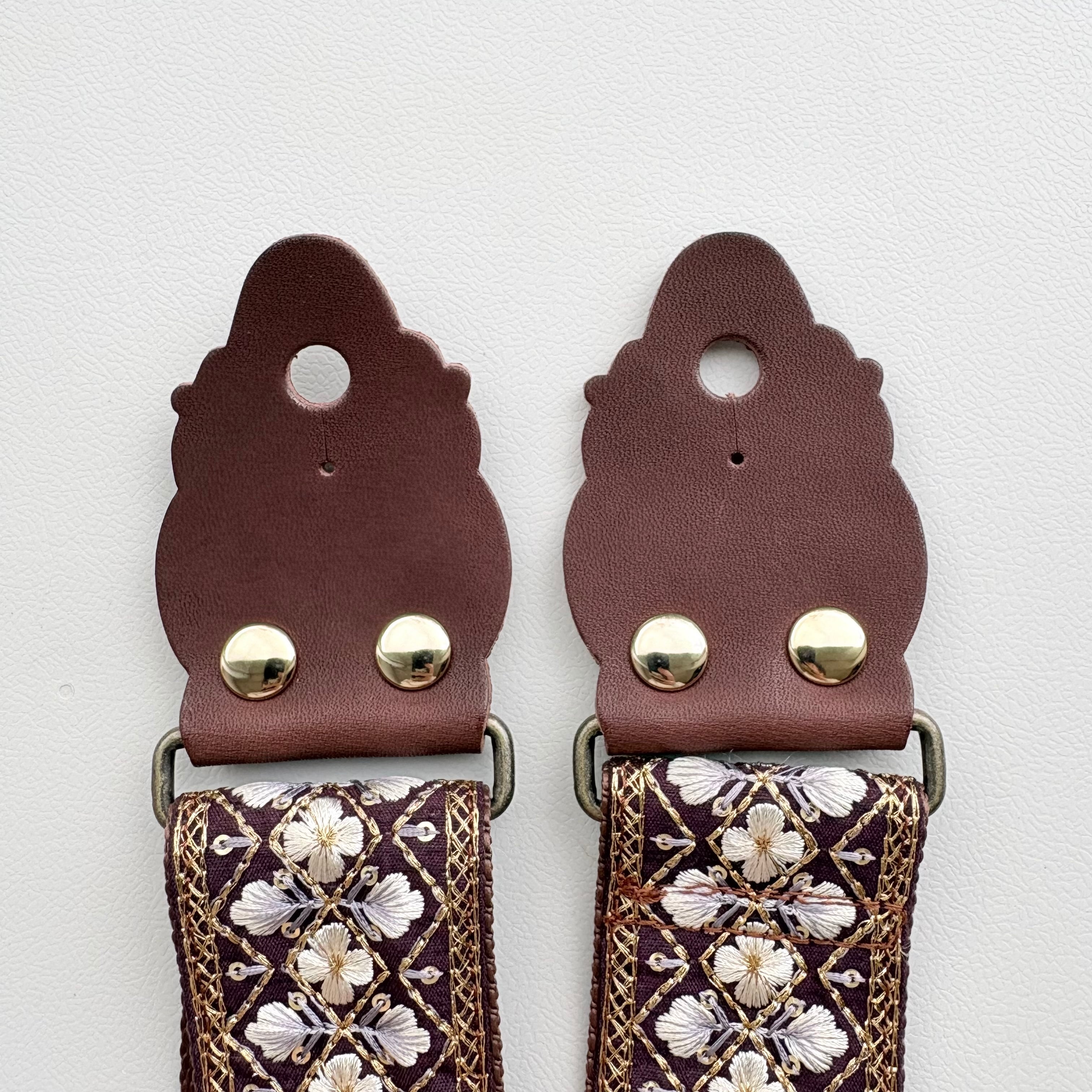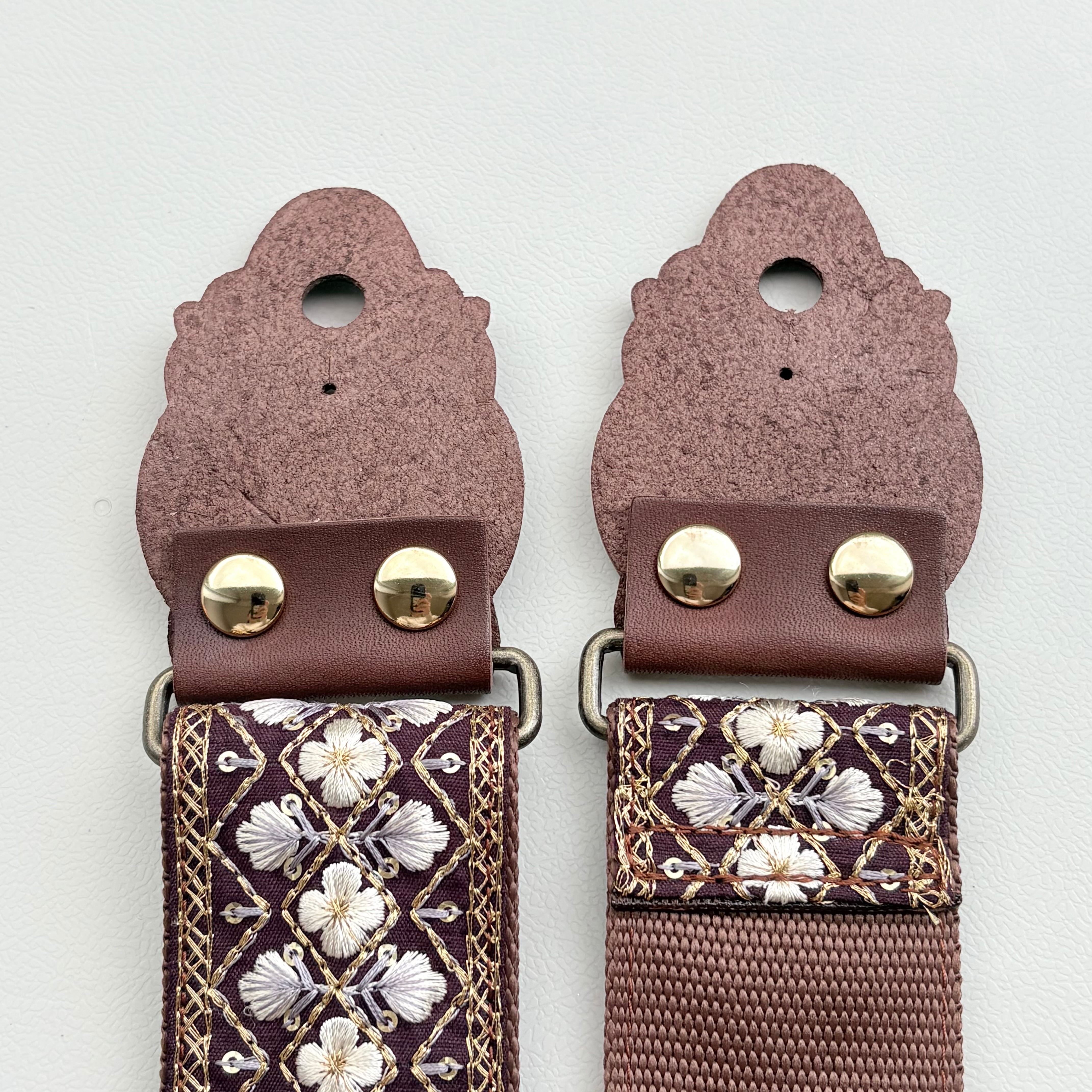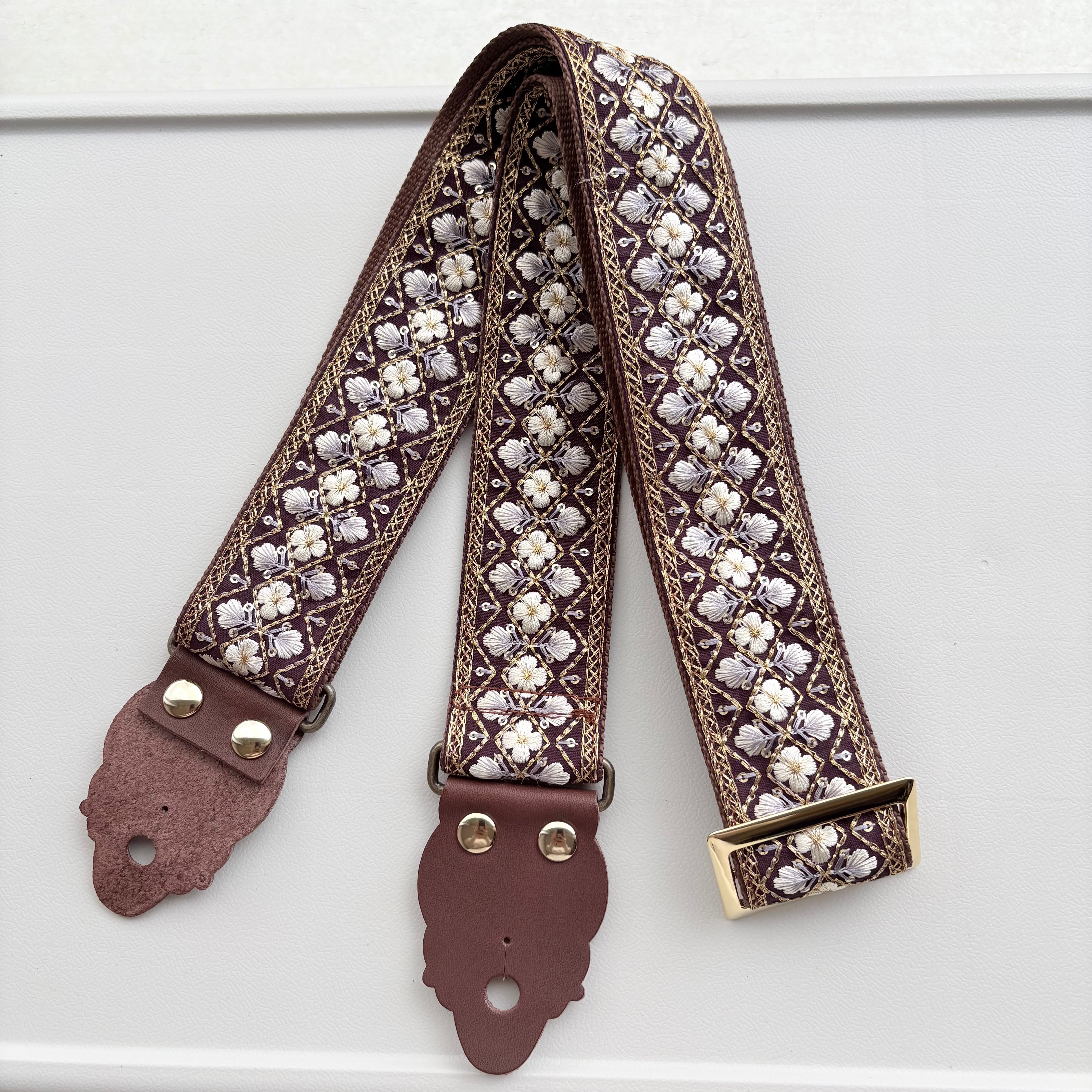紫色の生地にゴールドの刺繍糸と白のお花の美しさが際立つデザインです。インド刺繍リボンの繊細な刺繍が施されているからこそ、上品な仕上がりになりました。落ち着いた色なので、どんな色のギターにも合わせやすいでしょう。