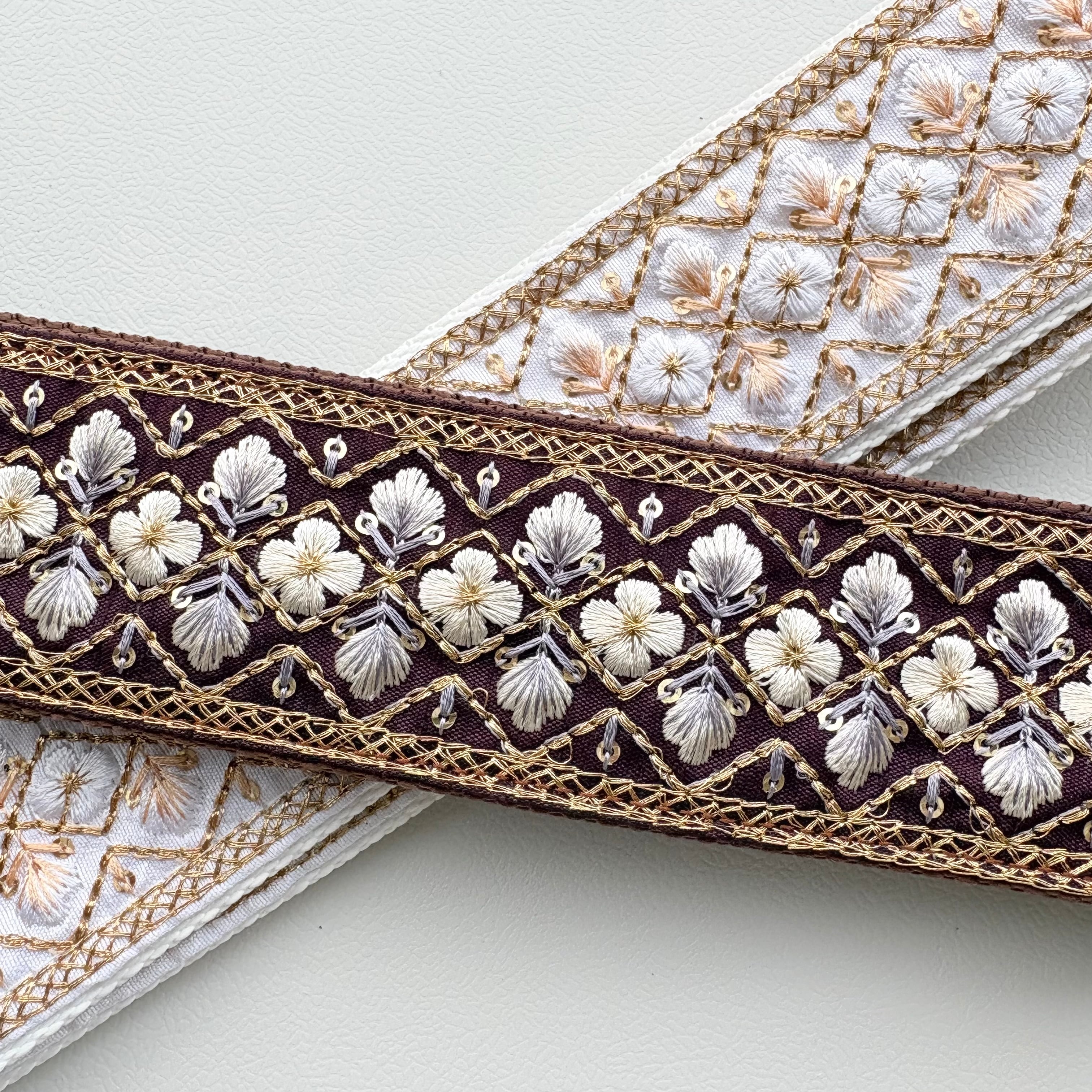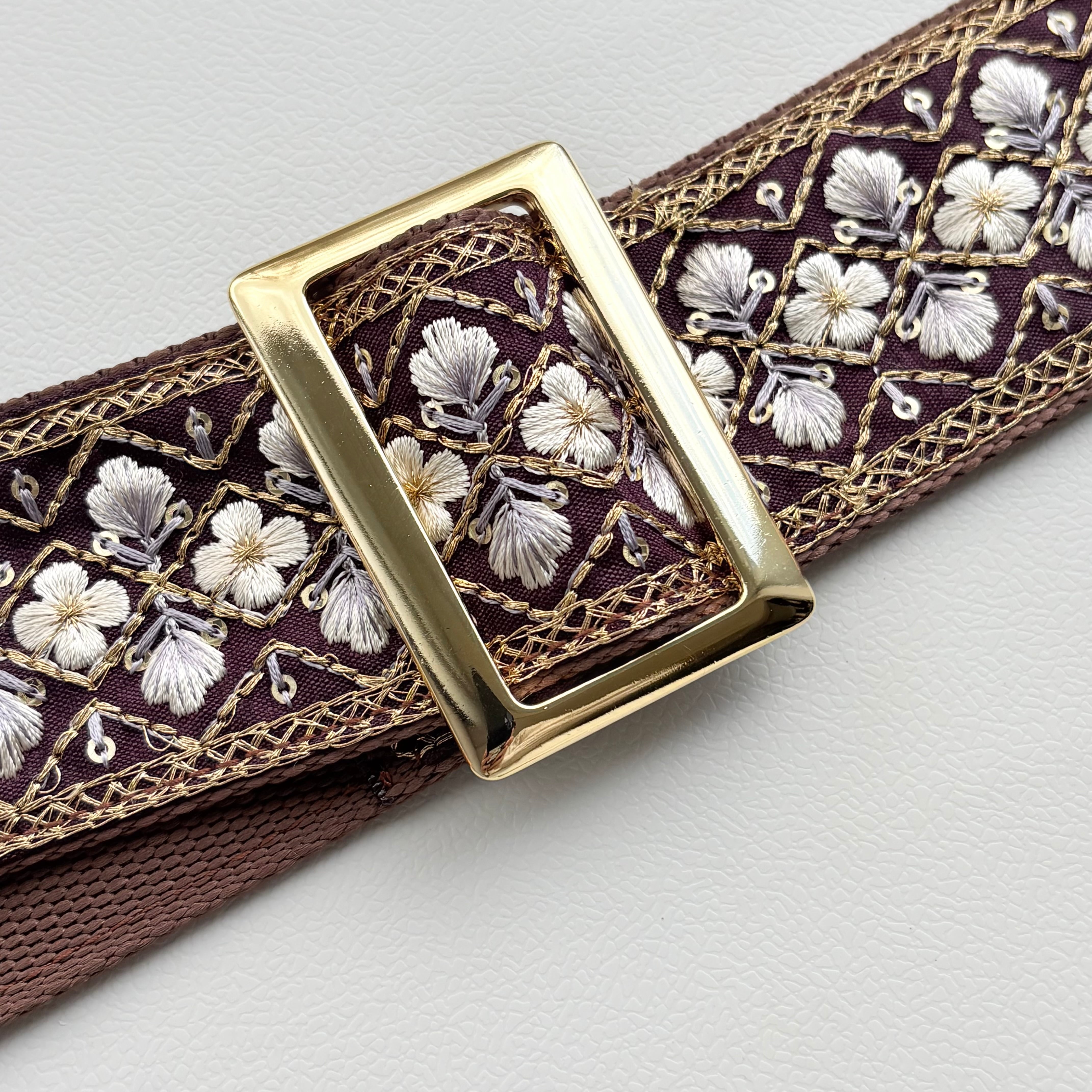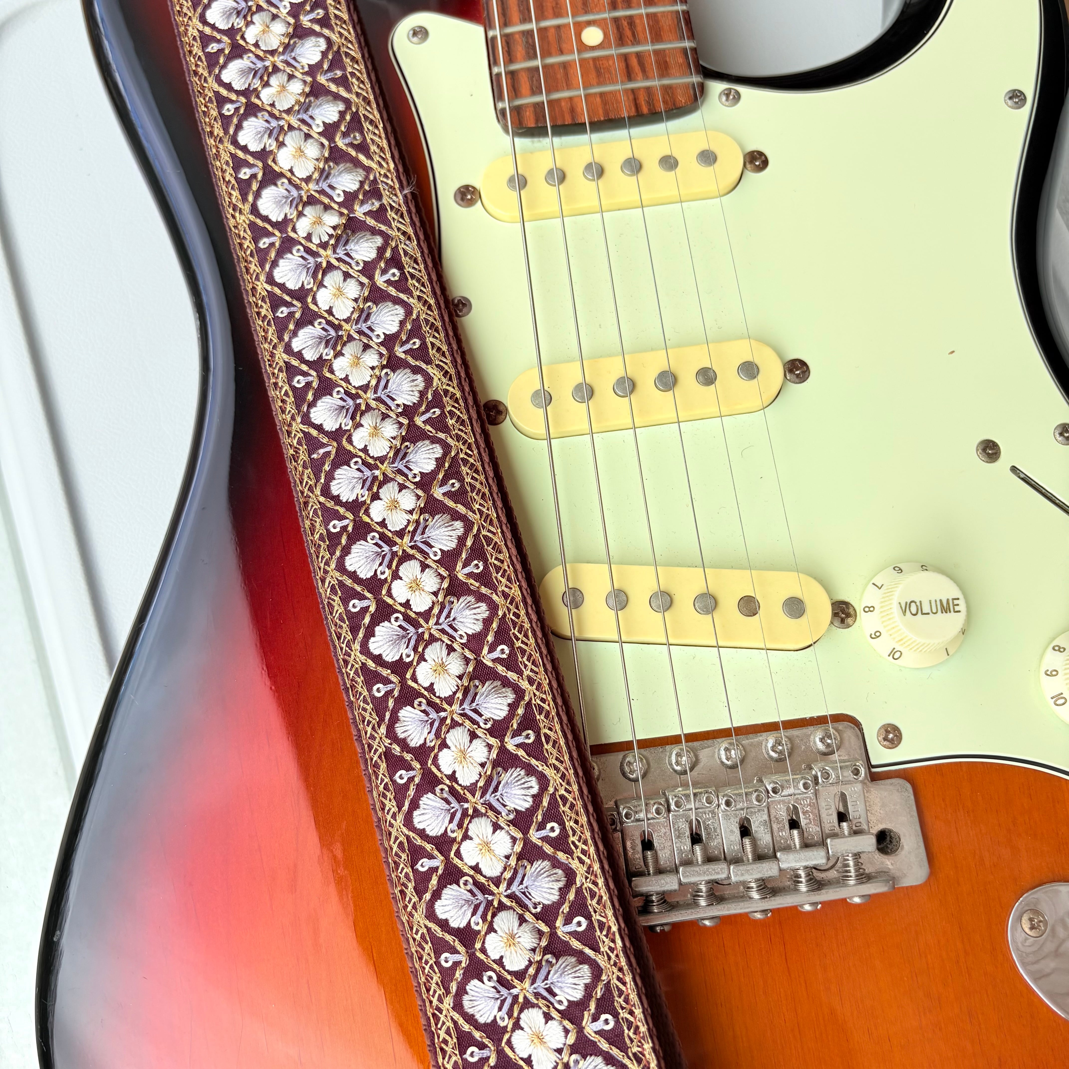 紫色の生地にゴールドの刺繍糸と白のお花の美しさが際立つデザインです。インド刺繍リボンの繊細な刺繍が施されているからこそ、上品な仕上がりになりました。落ち着いた色なので、どんな色のギターにも合わせやすいでしょう。