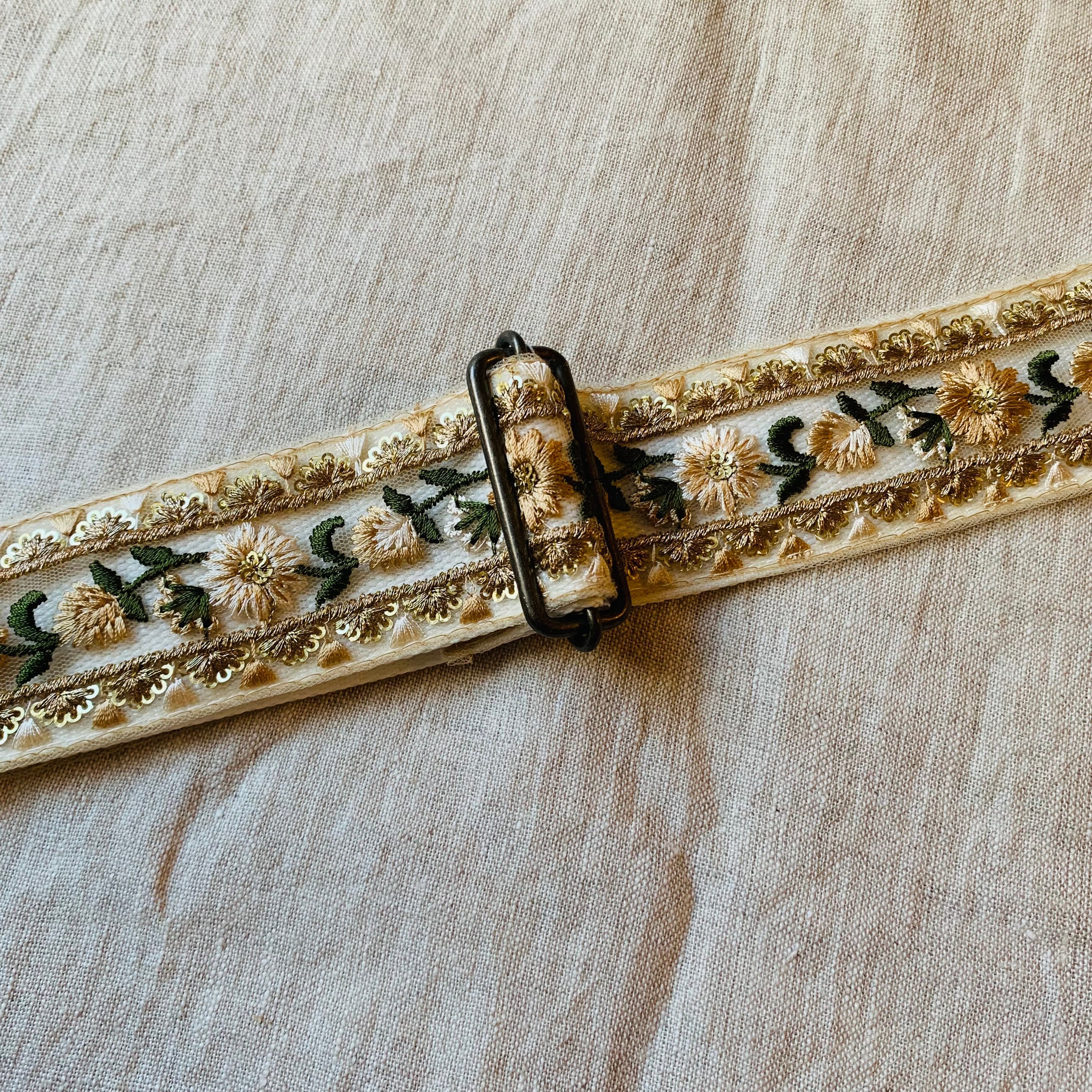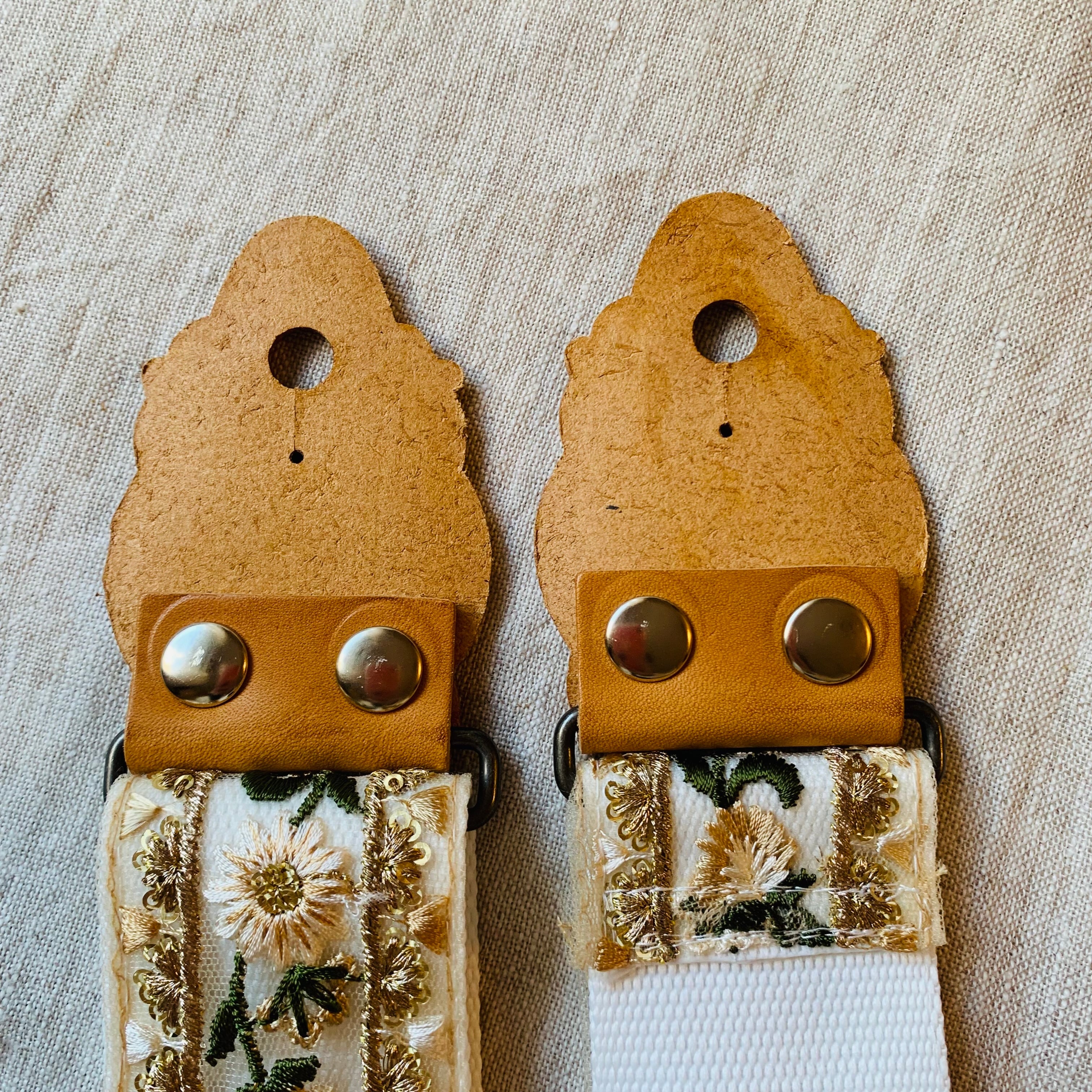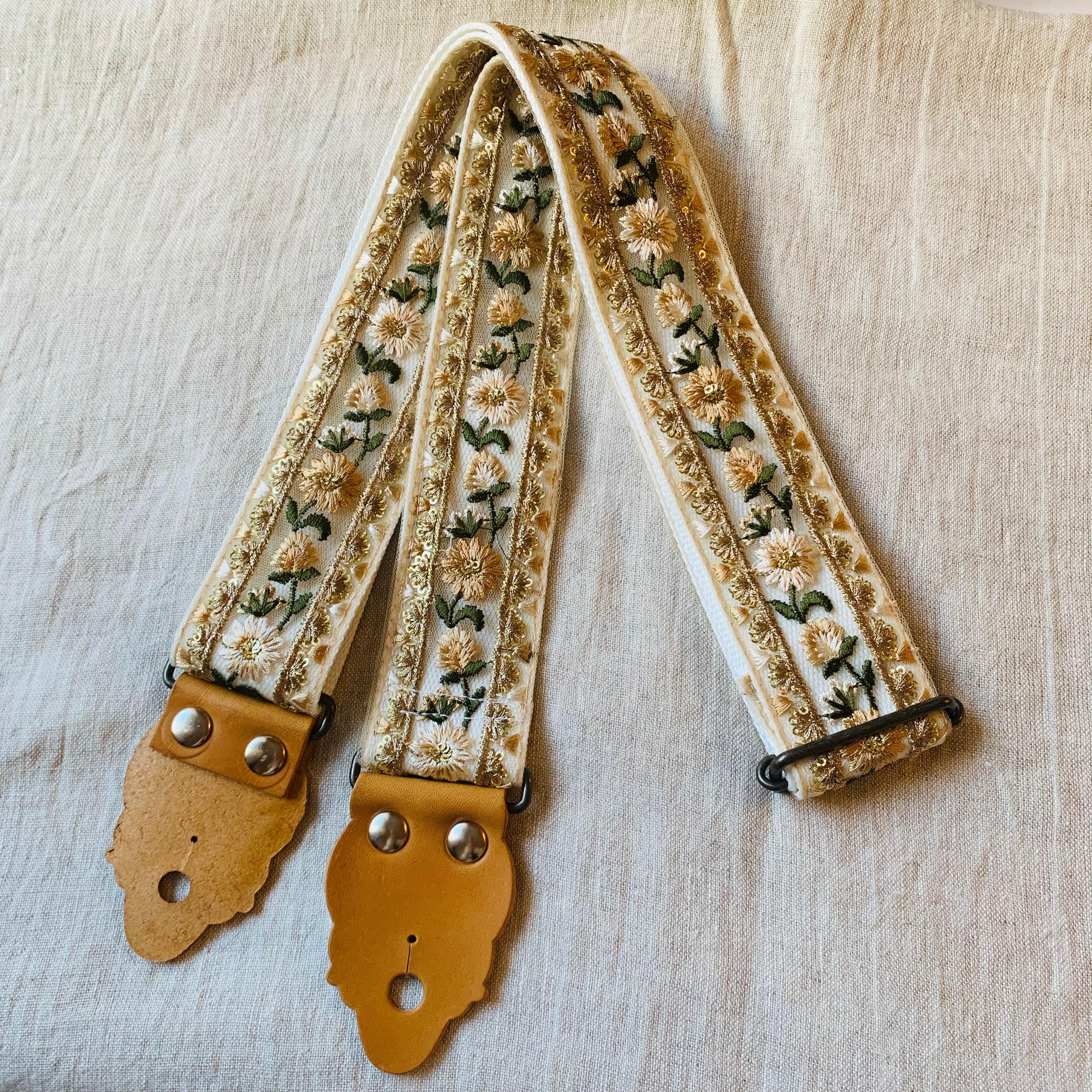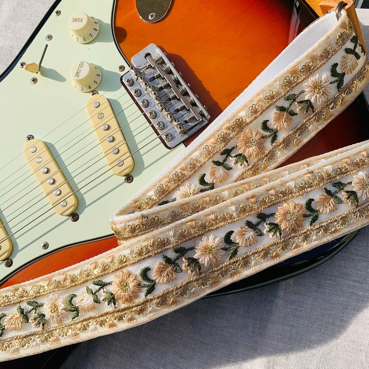 白いお花とゴールドの刺繍糸で縁取られた繊細なデザインは、どんなギターにも合わせやすく、上品な印象を与えてくれます。ゴールドのスパンコールが光に当たるとキラキラと光って綺麗です。