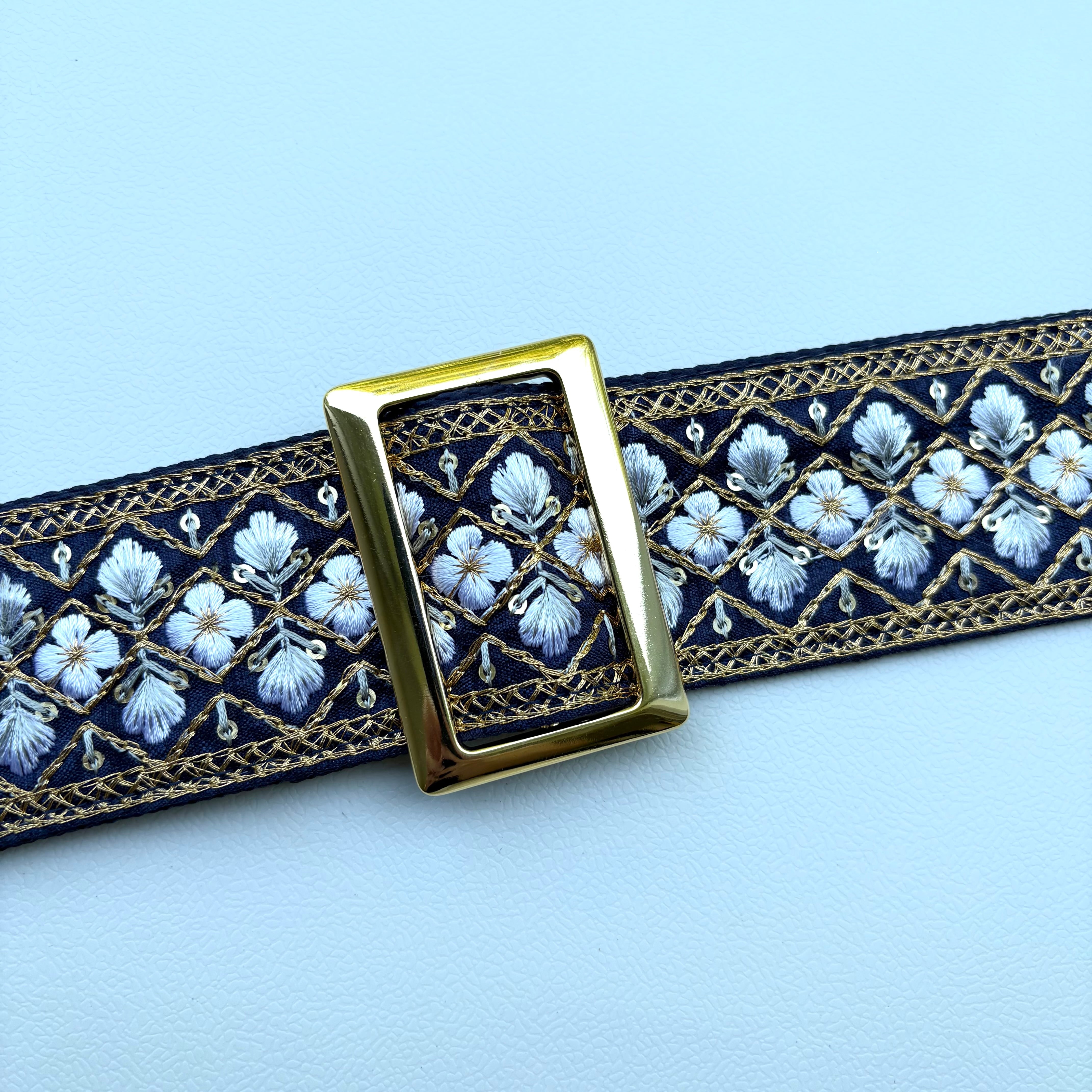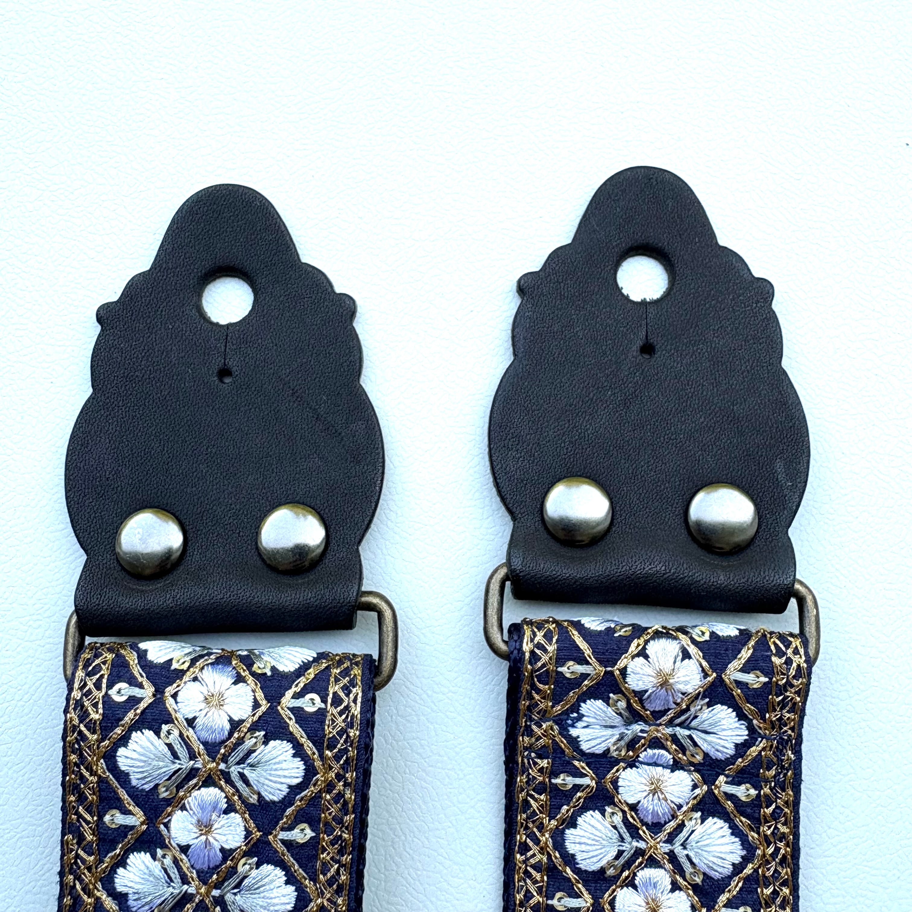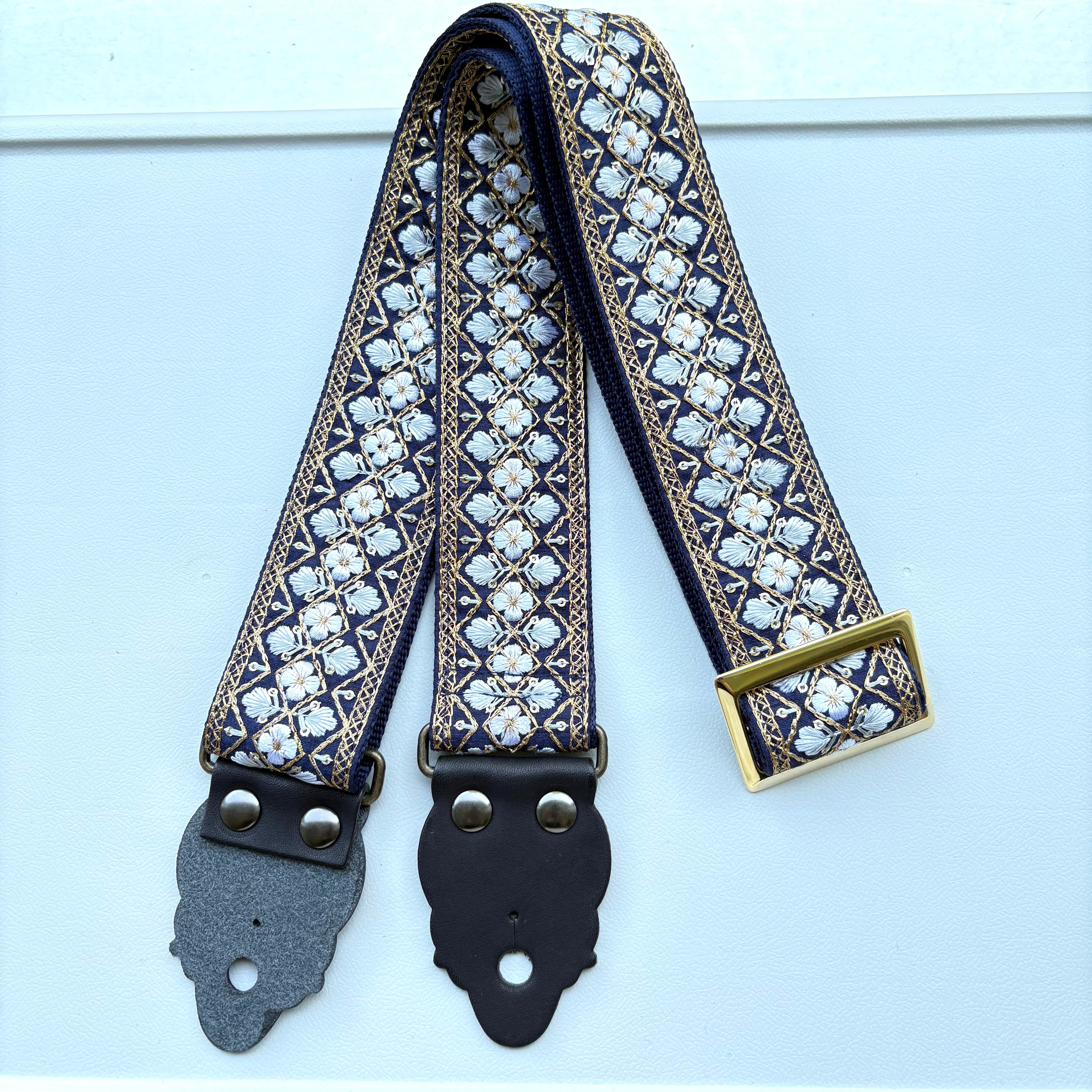 紺色の生地にゴールドの刺繍糸と白のお花の美しさが際立つデザインです。インド刺繍リボンの繊細な刺繍が施されているからこそ、上品な仕上がりになりました。紺色なので、どんな色のギターにも合わせやすいでしょう。